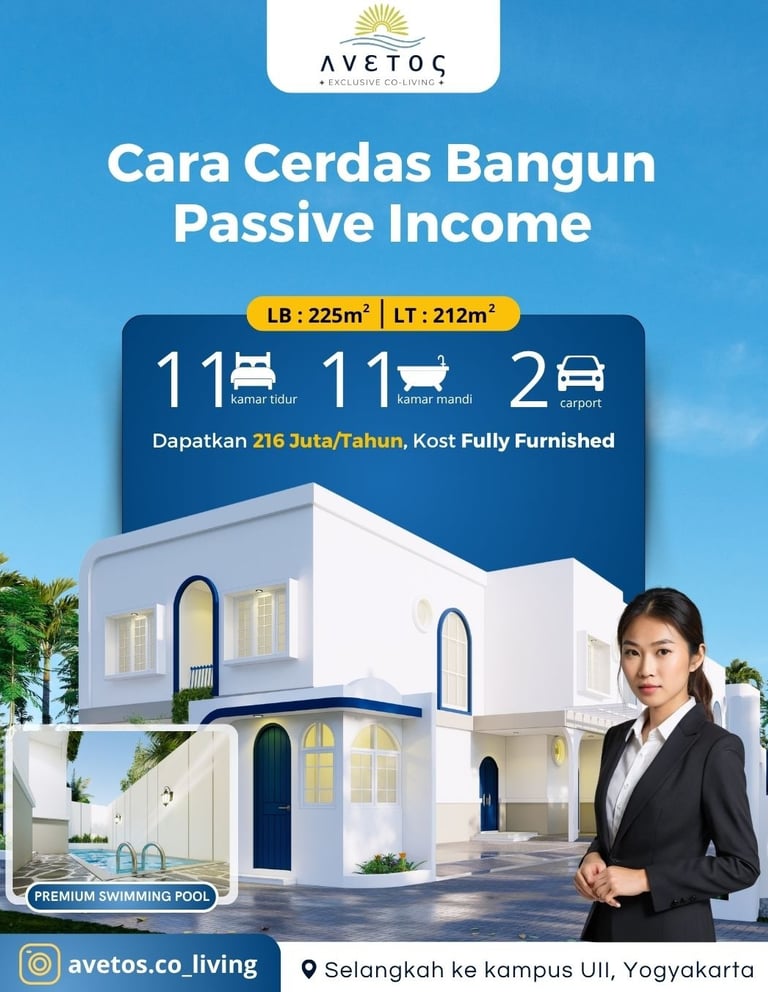 Rumah Kost Santorini Pertama di Jogja β Estetik, Nyaman, dan Eksklusif! Rumah Kost berkonsep Santorini dengan desain putih-biru yang elegan, menciptakan suasana tenang dan instagrammable. Dilengkapi fasilitas lengkap seperti kamar furnished, AC, Wi-Fi, dan area bersantai, serta berada di lokasi strategis dekat Universita Islam Indonesia, kuliner, dan pusat kota. Dengan lingkungan yang nyaman, kost ini ideal untuk mahasiswa, pekerja, dan cocok sebagai investasi masa tua yang bernilai tinggi dan menguntungkan.